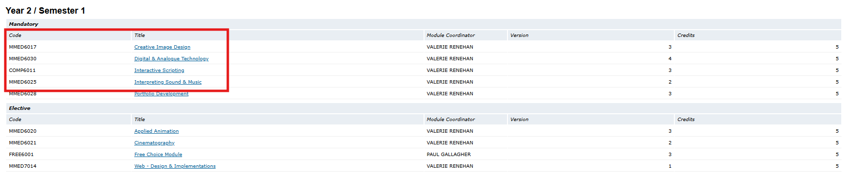 Step 3: You will then be brought to the Course Programme Page, which outlines all available Modules taught throughout the Course. Please note that Erasmus Students must select at least 4 modules from the one Course/Year/Semester. As seen by the example below: (Course = Creative Digital Media. 4 modules choosen from Year 2/Semester 1)